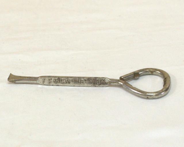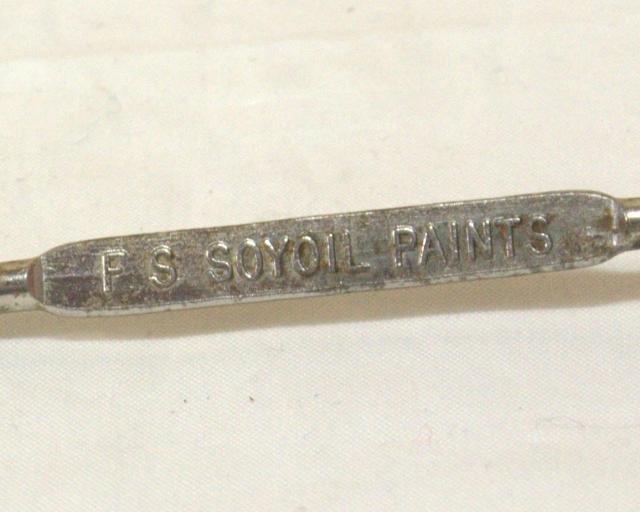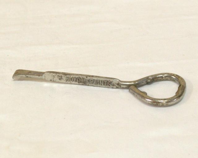 アンティーク 缶オープナー。アメリカ製、ペイント缶やオイルカンのふたオープナーとして便利な道具です。お店やお部屋に置いてディスプレイしたら、とっても良いですね。経年によるキズやサビ、汚れなどがあります。F S MULTI=FUE PAINTS、F S SOYOIL PAINTSの刻印があります