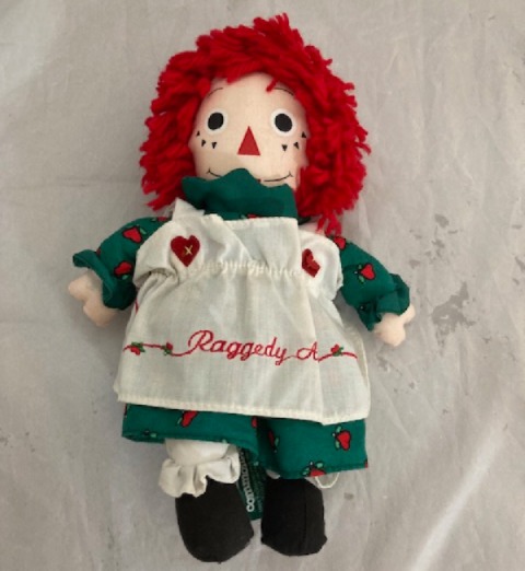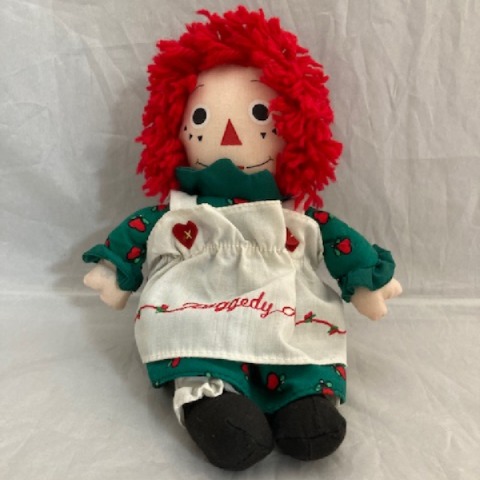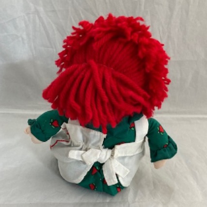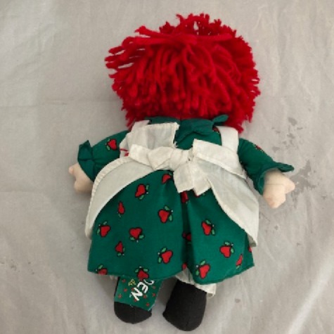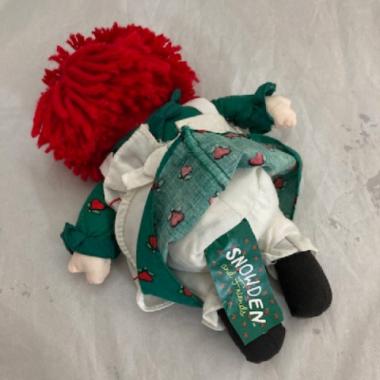 アンティーク ラガディ SNOWDEN ビーンズAnn 。スノーデン社。グリーンに赤いハート柄のお洋服を着た、とってもカワイイRaggedy Annです。お尻にビーンズが入っているので可愛く座ります。サイズ:20cm