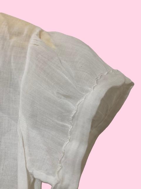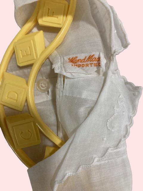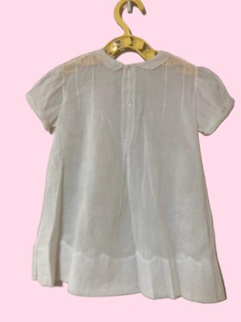アンティーク べビードレスホワイト ブルー三カ所刺繍。胸元のところに、とても可愛いブルーの刺繍がされています。とっても可愛くてオシャレなベビーアンティークドレスです。黄色の可愛いプラスティックハンガー付